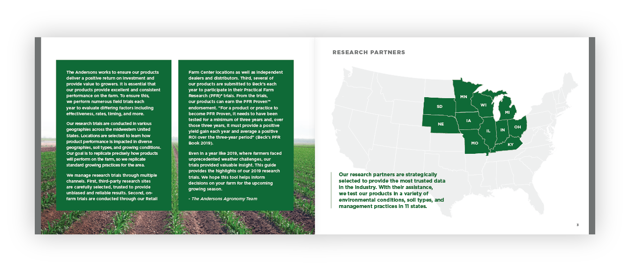 The Andersons works to ensure their products deliver a positive return on investment and provide value to growers. It is essential that their products provide excellent and consistent performance on the farm. This guide provides the highlights of their 2019 research trials.