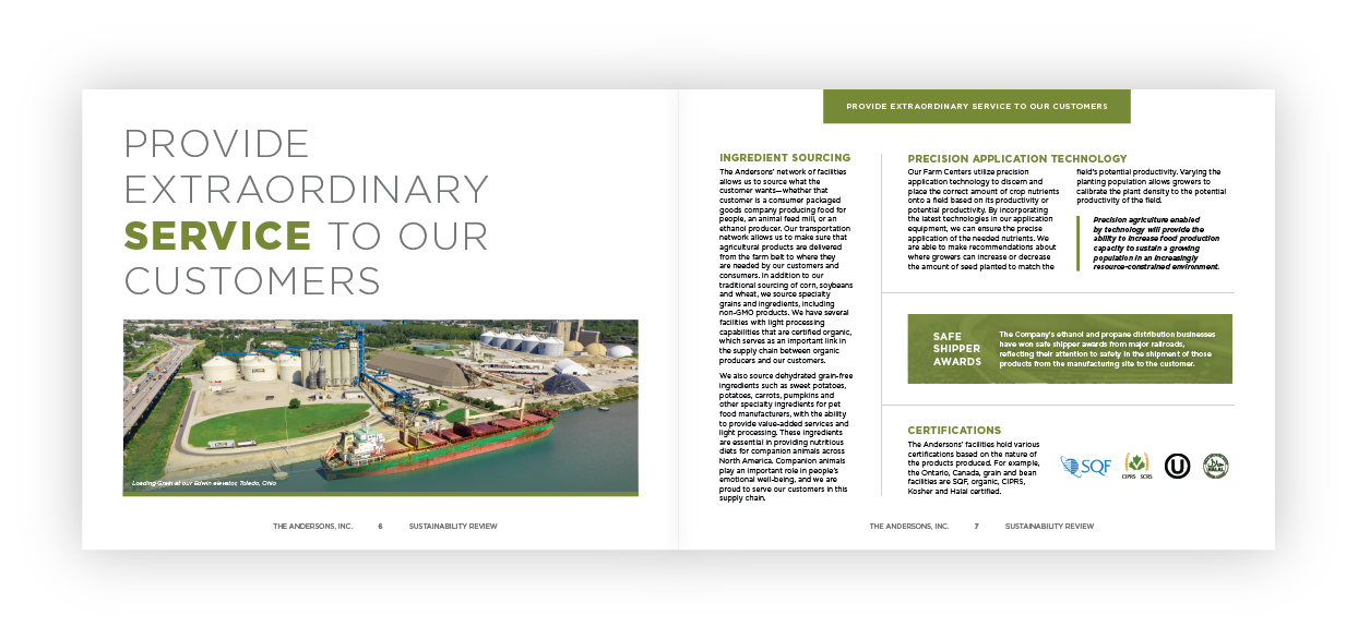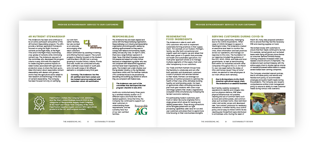 In The Andersons’ first formal sustainability update, they share some of the ways in which their dedication to service and sustainability is reflected in their mission statement, as they strive to: provide extraordinary service to customers, help each other improve, support their communities, and increase the value of the Company.